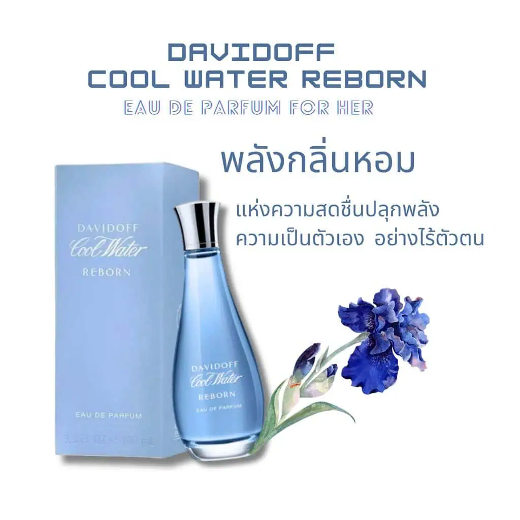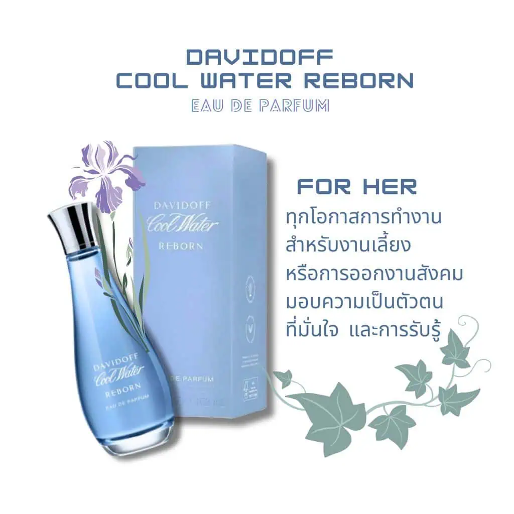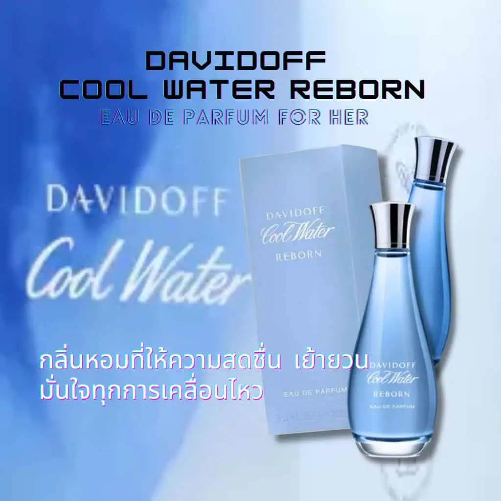 DAVIDOFF COOL WATER REBORN EDP/ for Her คือน้ำหอมผู้หญิงที่นำเสนอความรู้สึกสดชื่น เปี่ยมด้วยพลัง และพร้อมสำหรับการเริ่มต้นใหม่ในทุกๆ วัน เหมือนกับการได้ดำดิ่งลงไปในน้ำทะเลใสสะอาด กลิ่นหอมนี้ผสมผสานความสดชื่นของผลไม้ ความอบอุ่นของดอกไม้ และความลึกซึ้งของไม้หอมได้อย่างลงตัว ทำให้คุณรู้สึกสดชื่นและมีชีวิตชีวาในทุกๆ ครั้งที่ได้สัมผัส